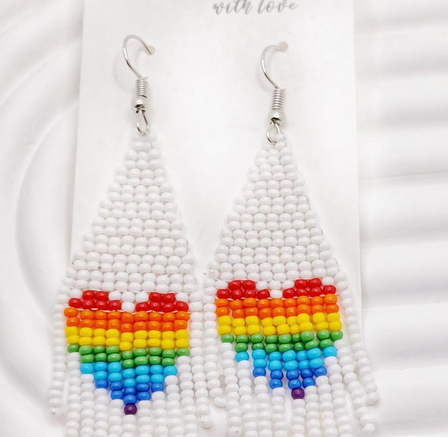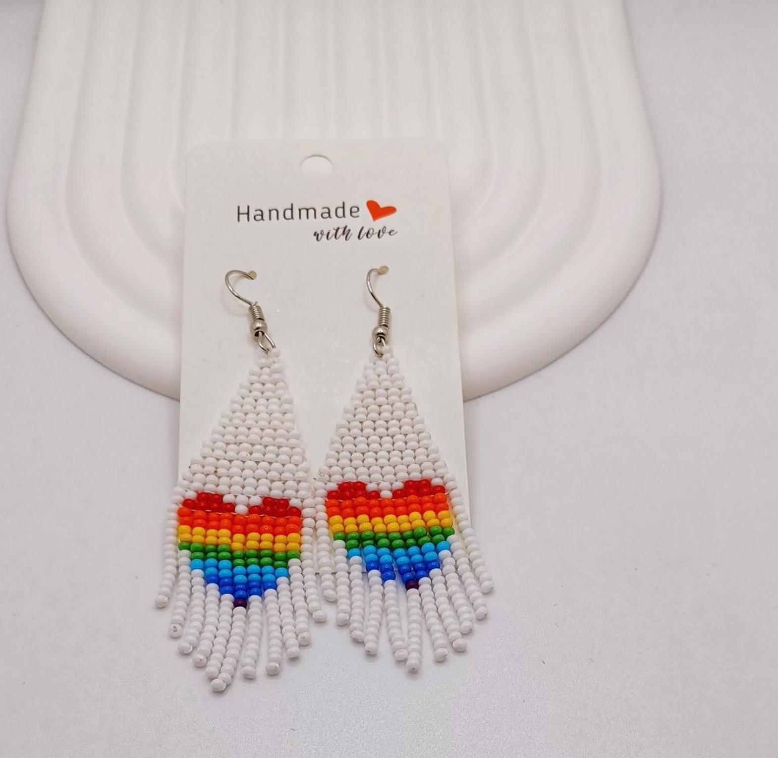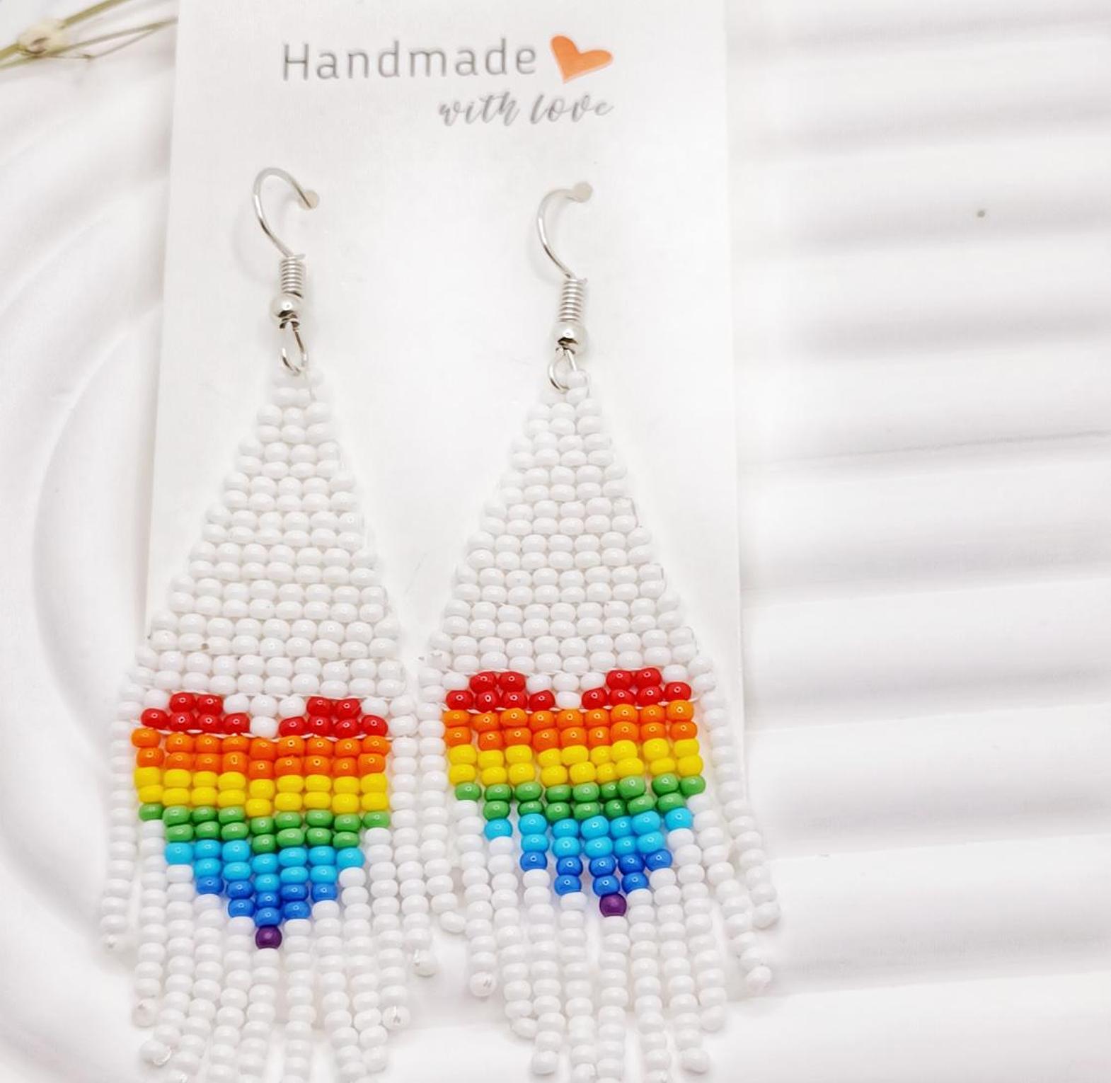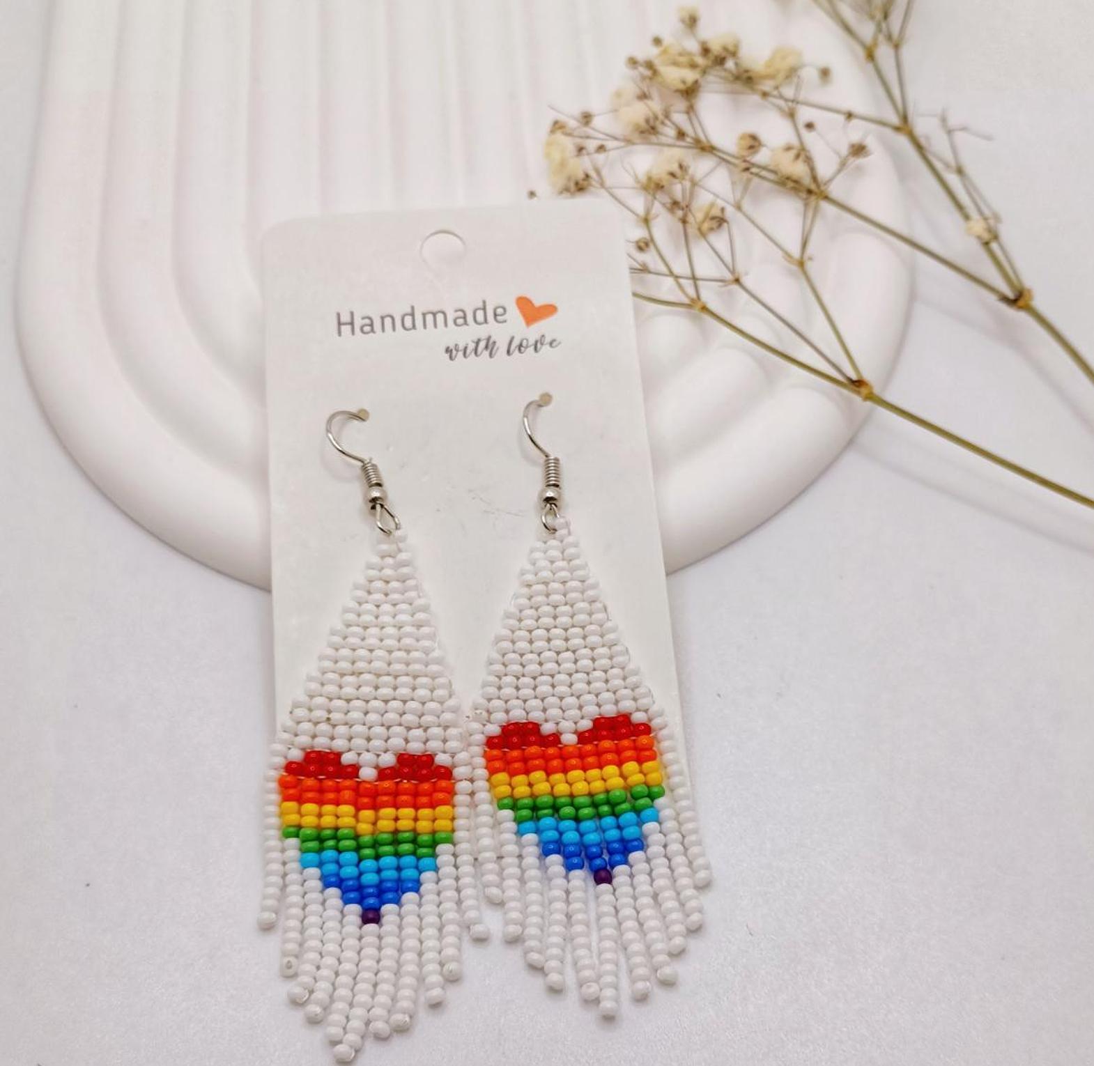 These stylish rainbow love-shaped beaded earrings are a perfect accessory for those who love a bit of color and whimsy. The earrings are crafted with colorful beads arranged in a heart shape, symbolizing love and affection. The rainbow color scheme adds a cheerful and optimistic vibe. These earrings are lightweight and comfortable to wear, making them ideal for everyday use or special occasions.